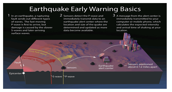 Earthquakes are caused by sudden release of energy from the Earth’s crust that creates seismic waves. However, different types of waves are sent out. Sensors detect the fast moving “P-wave” which is first to arrive and immediately transmit data to earthquake alert center where the size and location of quake is determined. Damage is caused by the “S-waves” and surface waves which arrive later and leaves a time gap for a message to be transmitted from the alert center to devices.