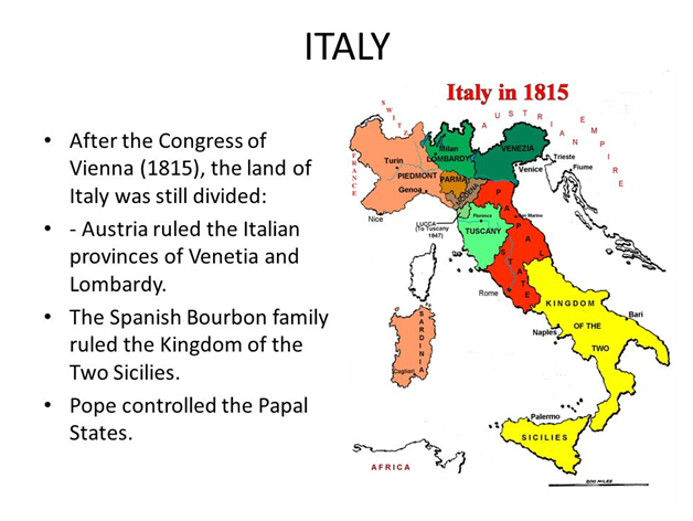 Italy had a long history of political fragmentation. Italy was divided into several states during the middle of the nineteenth century.