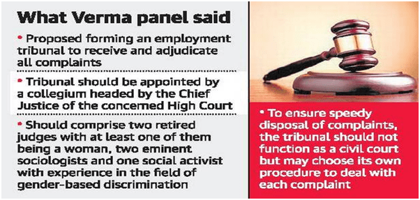 - As early as 2013, the Justice J.S. Verma Committee, in its landmark report on gender laws, had recommended setting up of an employment tribunal instead of an internal complaints committee (ICC) in sweeping changes to the Sexual Harassment at the Workplace Bill.
