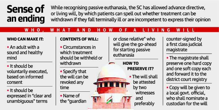 The Supreme Court (SC) allowed passive euthanasia and right to give advance medical directives or ‘Living Wills’, stating that human beings have the right to die with dignity as part of fundamental right, but made sure to set out strict guidelines that will govern when it is permitted.