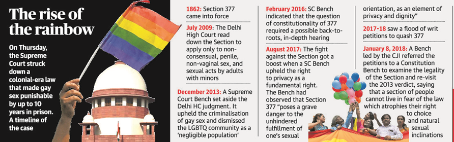 - A five-judge Constitution Bench of the Supreme Court decriminalised homosexuality, with a prayer to the LGBTQ community (Lesbian, Gay, Bisexual, Transgender and Queer) to forgive history for subjecting it to brutal suppression.