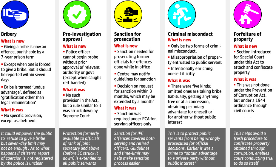 The bill redefines provisions related to criminal misconduct to only cover two types of offences viz. illicit enrichment (such as amassing of assets disproportionate to one’s known income sources) and fraudulent misappropriation of property.