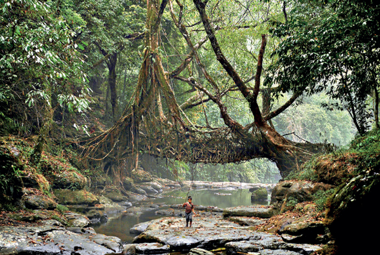 Meghalaya’s living root bridge system: Meghalaya has some of the highest rainfall in the world. When the monsoon comes, the rivers rushing by take out all the bridges, except for the living root bridges grown by the Khasi and Jaintia people. The Khasi community weaves together tree roots to make living bridges that can withstand monsoon storms and floods. These are built out of rubber fig trees planted near rivers by the community. They train the trees to grow across rivers and then, using bamboo scaffolding, they weave their secondary root systems together – after some years, you get a living root bridge. There are about 30 such bridges today and they are the most structurally efficient system possible.