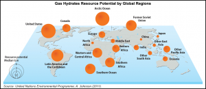 - The amount of gas within the world’s gas hydrate accumulations is estimated to greatly exceed the volume of all known conventional gas resources.